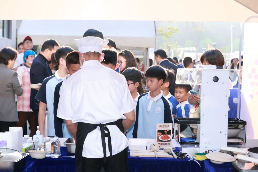 此外,最熱鬧的展臺要數(shù)“校長廚房”了。手起刀落間,食材變換形態(tài);鍋鏟舞動時,美味佳肴飄香。校長們系著圍裙,在智能廚電前各顯神通,連機(jī)器人也加入了進(jìn)來,他們以精湛廚藝征服現(xiàn)場孩子的味蕾。