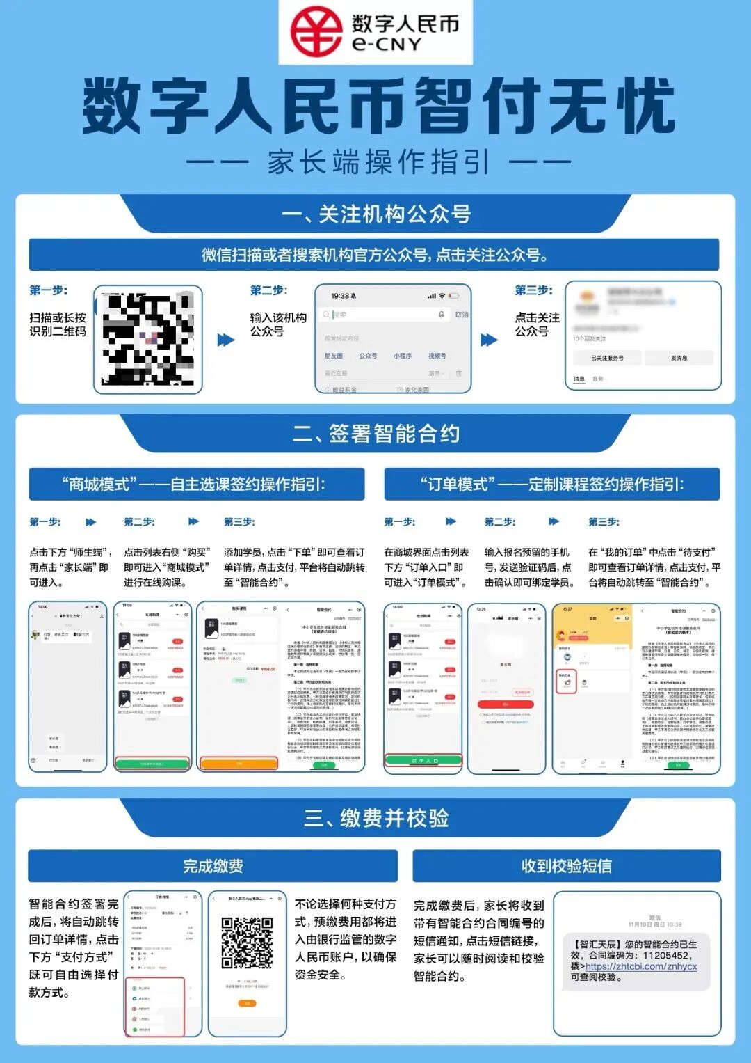 1.選機構(gòu):挑證照齊全、支持數(shù)字人民幣預(yù)付費監(jiān)管的合規(guī)機構(gòu)(可通過機構(gòu)或銀行平臺公示確認);