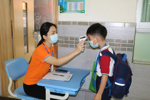“Good morning, teacher.”久違的問(wèn)候聲,喚醒清晨的校園。4月13日早上,翻身實(shí)驗(yàn)學(xué)校(東校區(qū))小學(xué)部學(xué)生有序返回校園。校領(lǐng)導(dǎo)、值日行政和老師、家長(zhǎng)義工,五步一崗十步一哨,嚴(yán)把入校關(guān)口,引導(dǎo)學(xué)生保持距離、測(cè)溫、洗手消毒,有條不紊錯(cuò)峰入校。